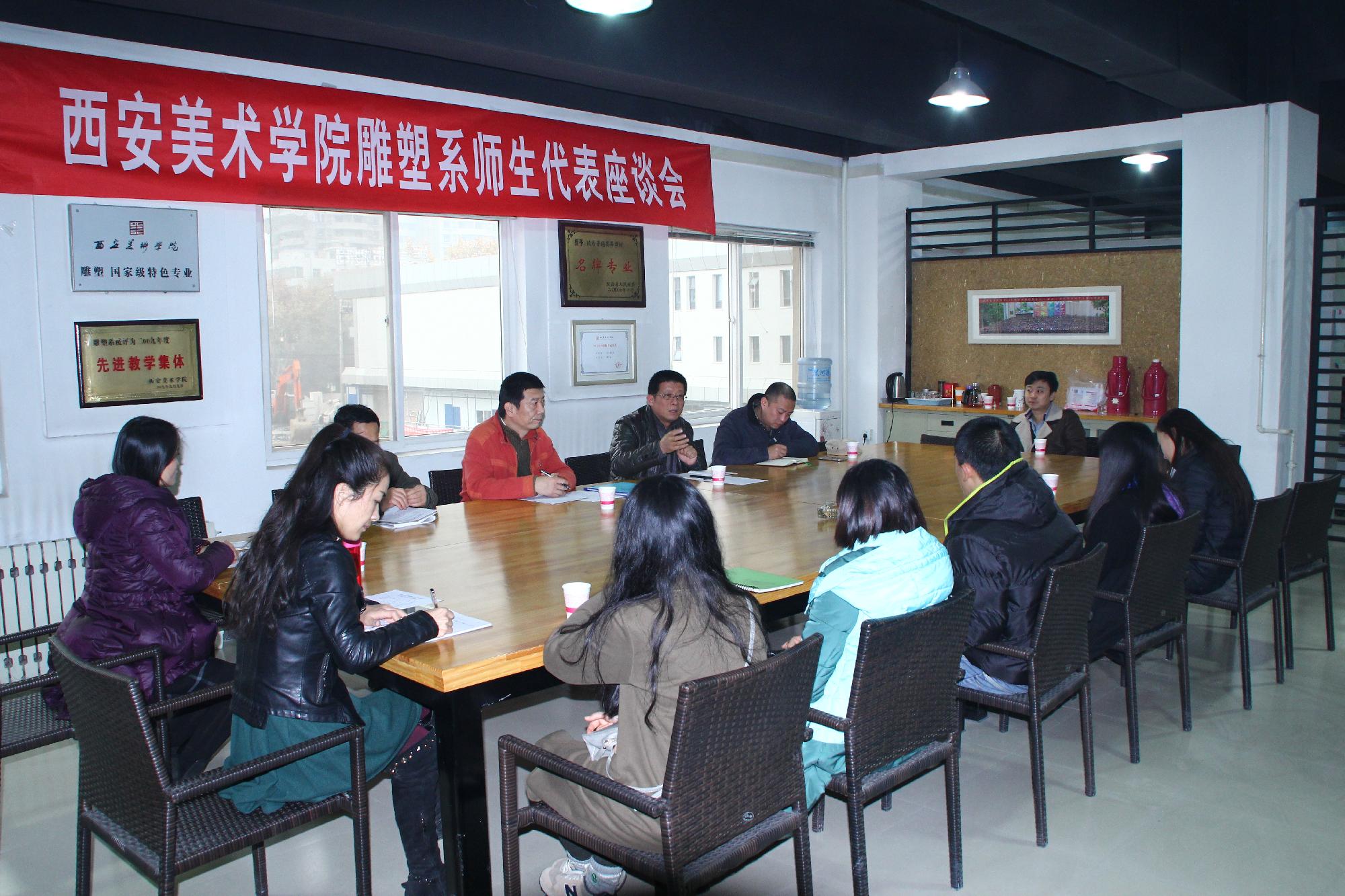 2015年12月8日下午,雕塑系组织部分教师、学生召开了教学质量月“师生代表座谈会”,西安美术学院党委赵万东副书记参加了这次座谈会。座谈会围绕雕塑系教风、学风的改进与提高,教学工作中存在的问题以及雕塑系的长远发展和教学改革进行了广泛深入的座谈。赵万东副书记就雕塑系教学质量、教师管理、学风的自查及重视平时学生有关教学问题的搜集汇总反馈等提出了意见和要求。座谈会上教师与学生分别从各个方面对教学工作提出了意见建议,大家各抒己见,热烈交流,一致表示通过此次座谈会查摆了问题,加强了沟通,密切了师生关系,是对雕塑系今后各项工作的有力促进。